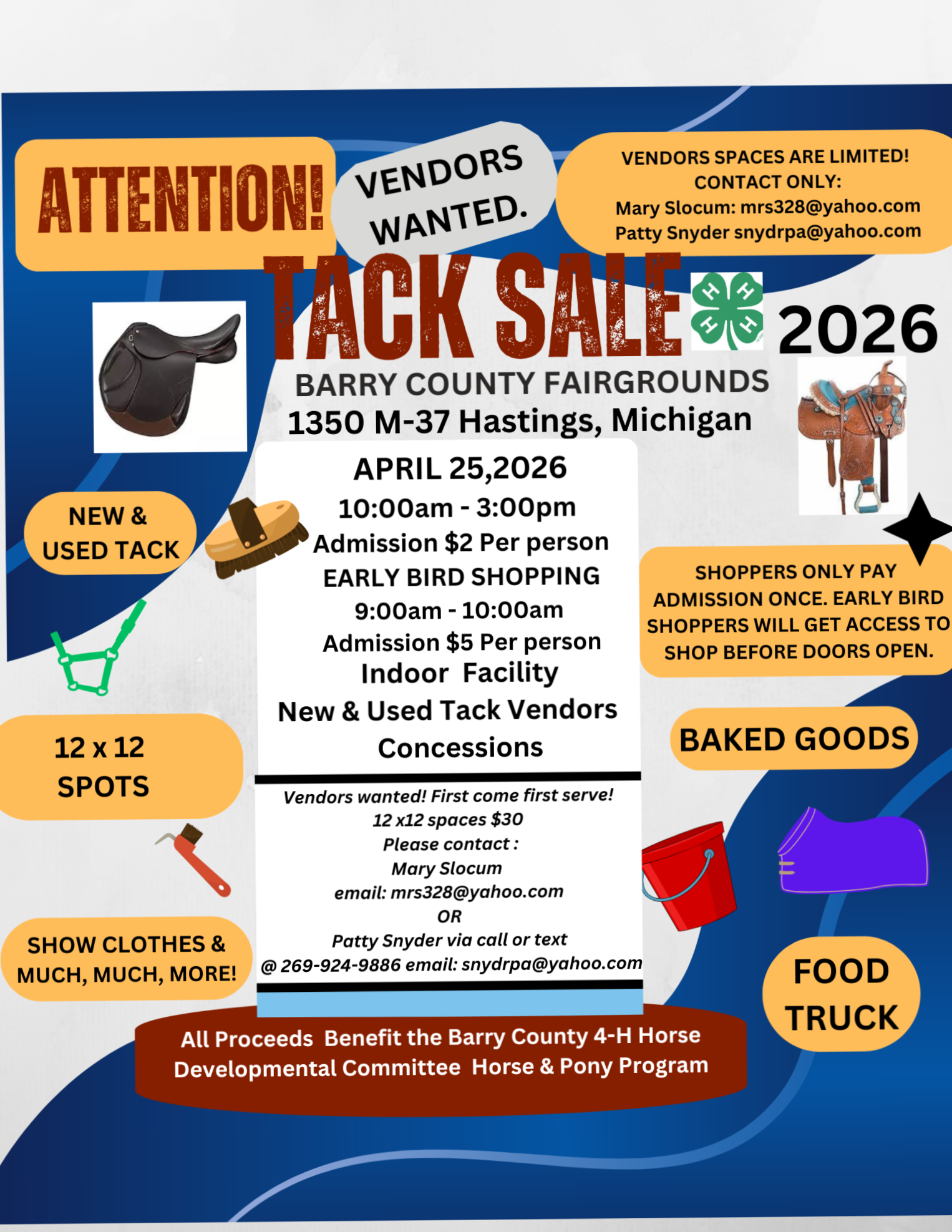 Having a tack Sale on April 25th 2026 at the Barry Expo, doors open for early bird shopping from 9am to 10am . Tack from 10 am to 3 pm .come out and support the 4-H Horse program.